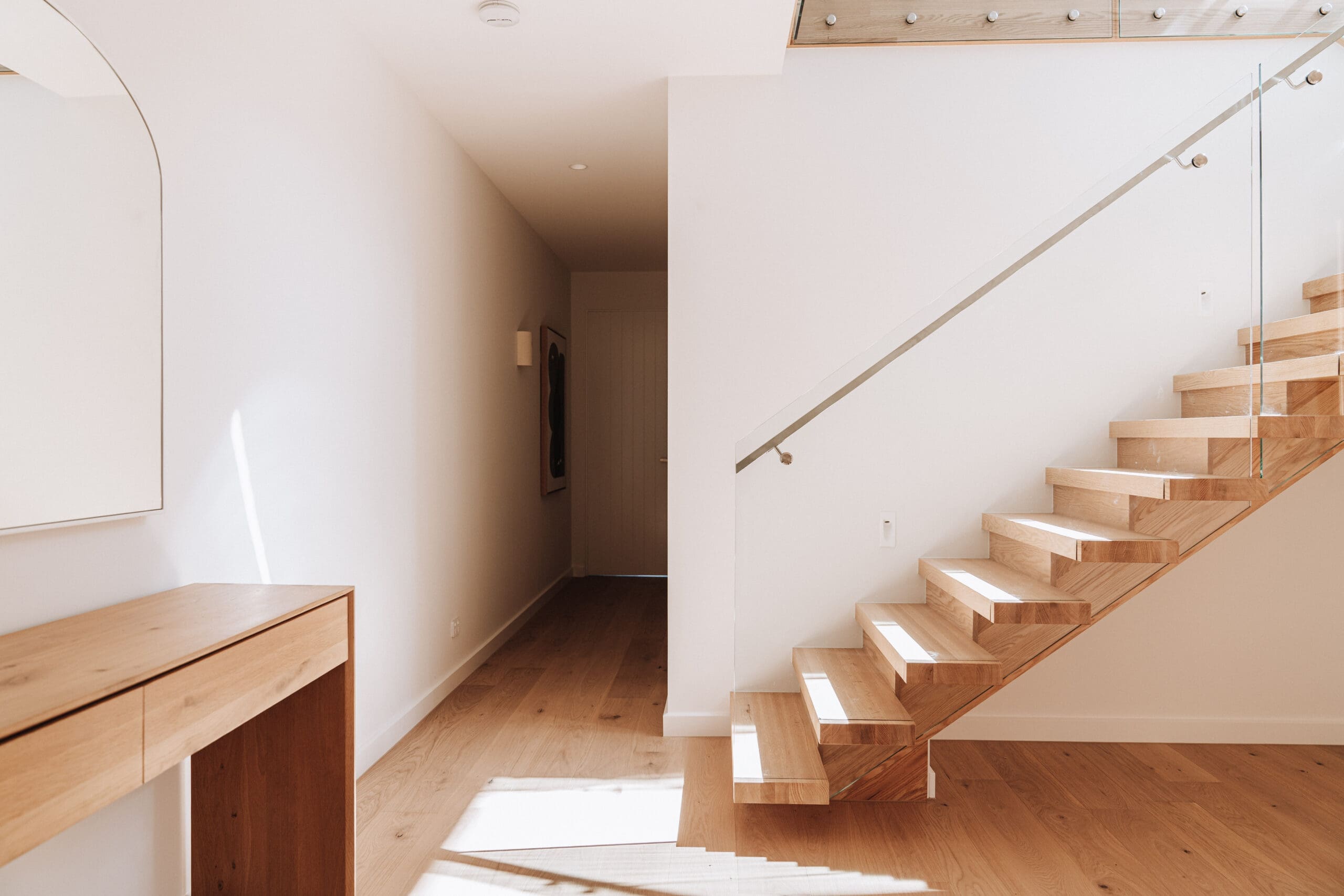 - Semi-cantilevered staircase with concealed stringer and frameless glass balustrade.